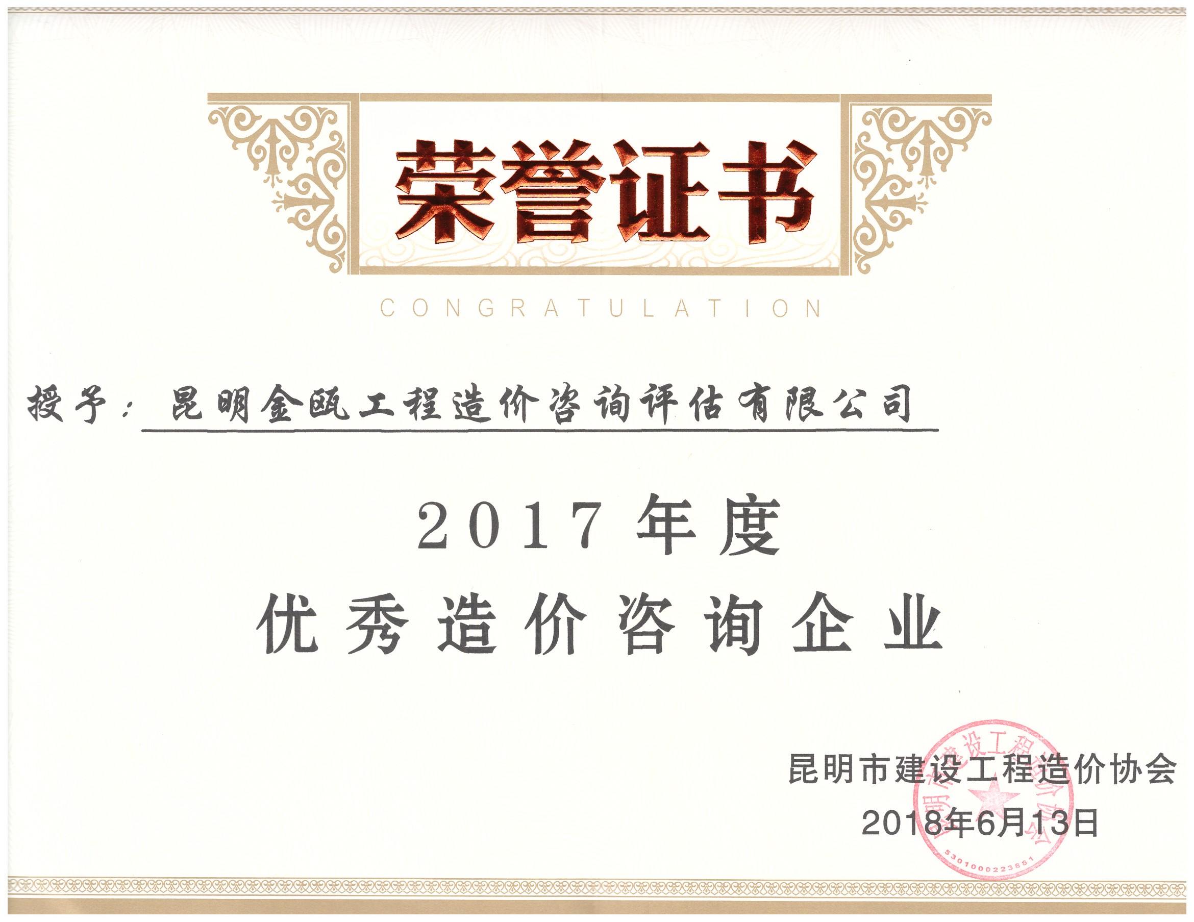 熱烈祝賀昆明金甌工程造價(jià)咨詢評估有限公司榮獲昆明市建設(shè)工程造價(jià)協(xié)會