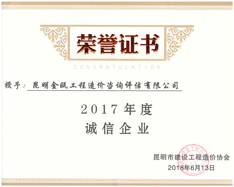 熱烈祝賀昆明金甌工程造價(jià)咨詢評估有限公司榮獲昆明市建設(shè)工程造價(jià)協(xié)會: